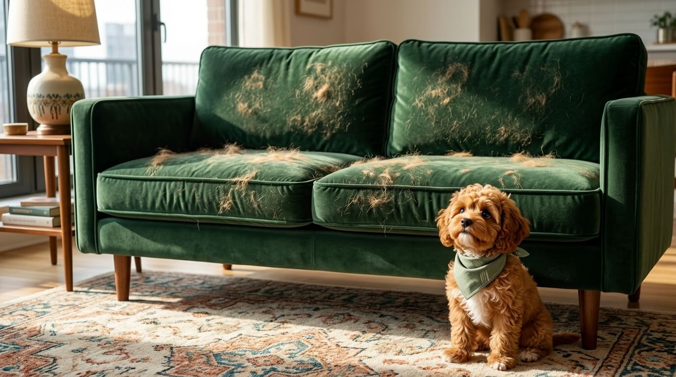 The real problem is not just aesthetics. Trapped dog hair holds dander and skin oils against fabric fibers. This is precisely why removing the fur is the most important first step if you want to learn [How To Control Dog Odor Apartment (7 Best Fixes)] — because the smell is living inside those fibers right along with the fur.