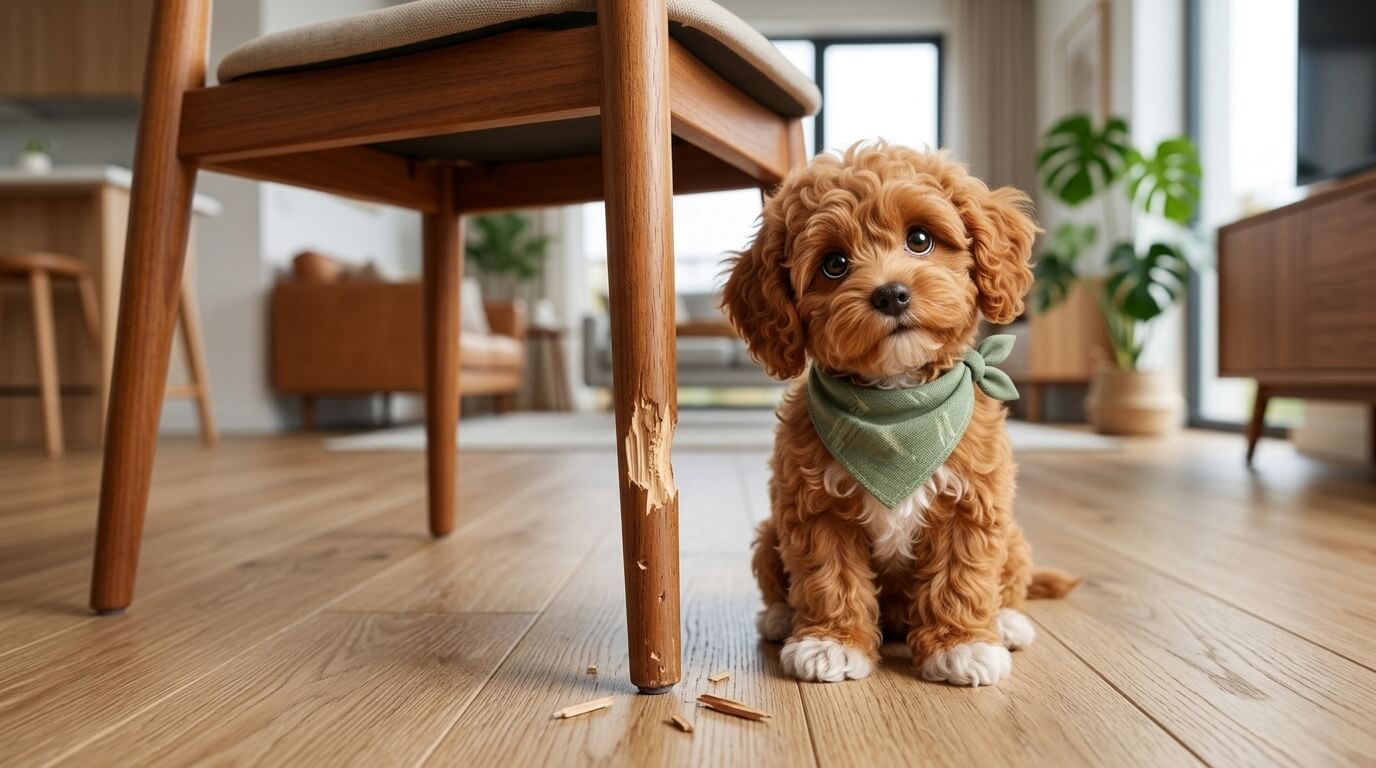 A Cavapoo puppy sitting next to a chewed chair leg showing the urgent need to stop dog chewing furniture